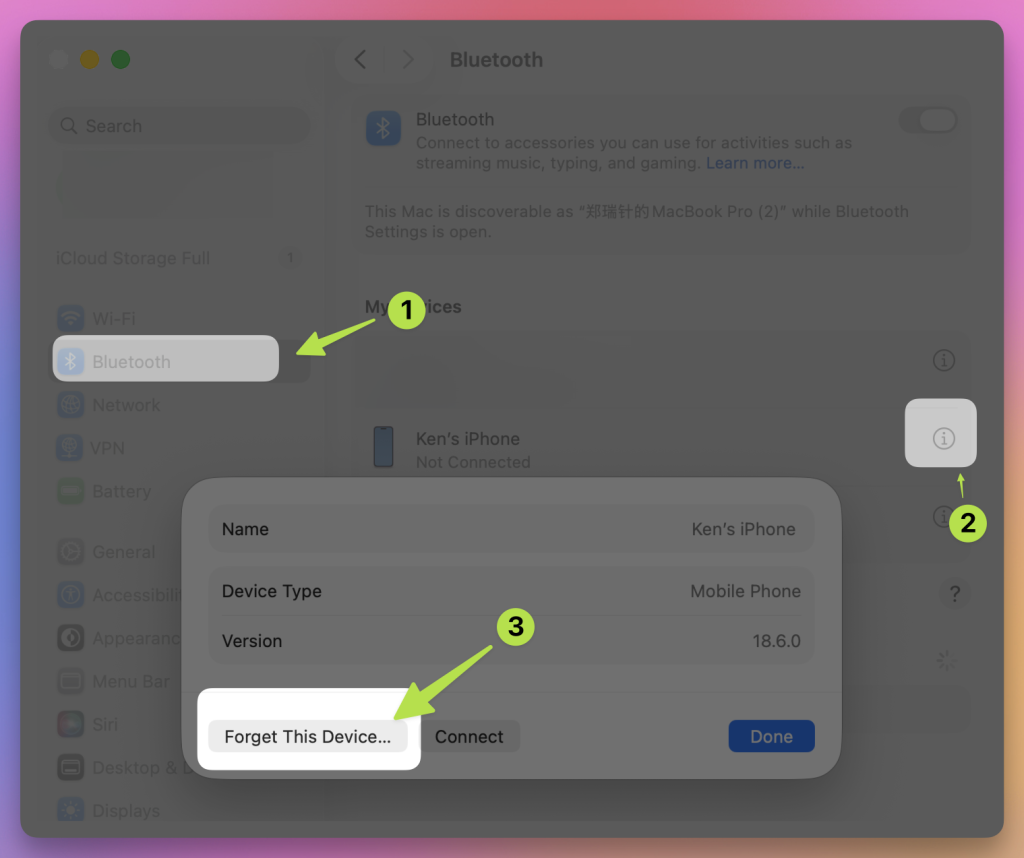 When connecting your MacBook and iPhone via Bluetooth, it’s important to make sure both devices are properly paired with each other. Bluetooth pairing must be consistent on both sides. If one device is paired while the other has already forgotten the device, the connection may fail or the iPhone may not show up at all.