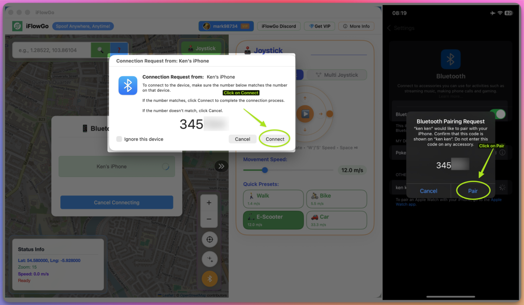 Your Mac and iPhone are now linked via Bluetooth, and you can start using iFlowGo to change your location freely.
